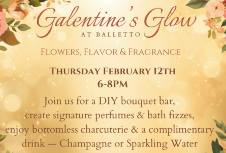 Grab your girls for a Galentine’s night at Balletto Winery. Sip bubbly, create florals and fragrance, enjoy endless charcuterie, and celebrate friendship with music, photos, and feel-good vibes.