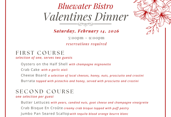 Celebrate Valentine’s Day at Bluewater Bistro with a special four-course dinner. $85 per person plus tax and tip. RSVP to events@bhha.org by Tuesday, February 10.
